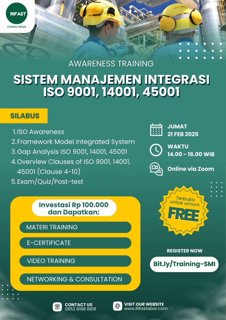 Ingin meningkatkan kompetensi dan karier di bidang manajemen mutu, lingkungan, dan keselamatan kerja? Yuk, ikuti AWARNESS TRAINING: SISTEM MANAJEMEN INTEGRASI ISO 9001, 14001, 45001